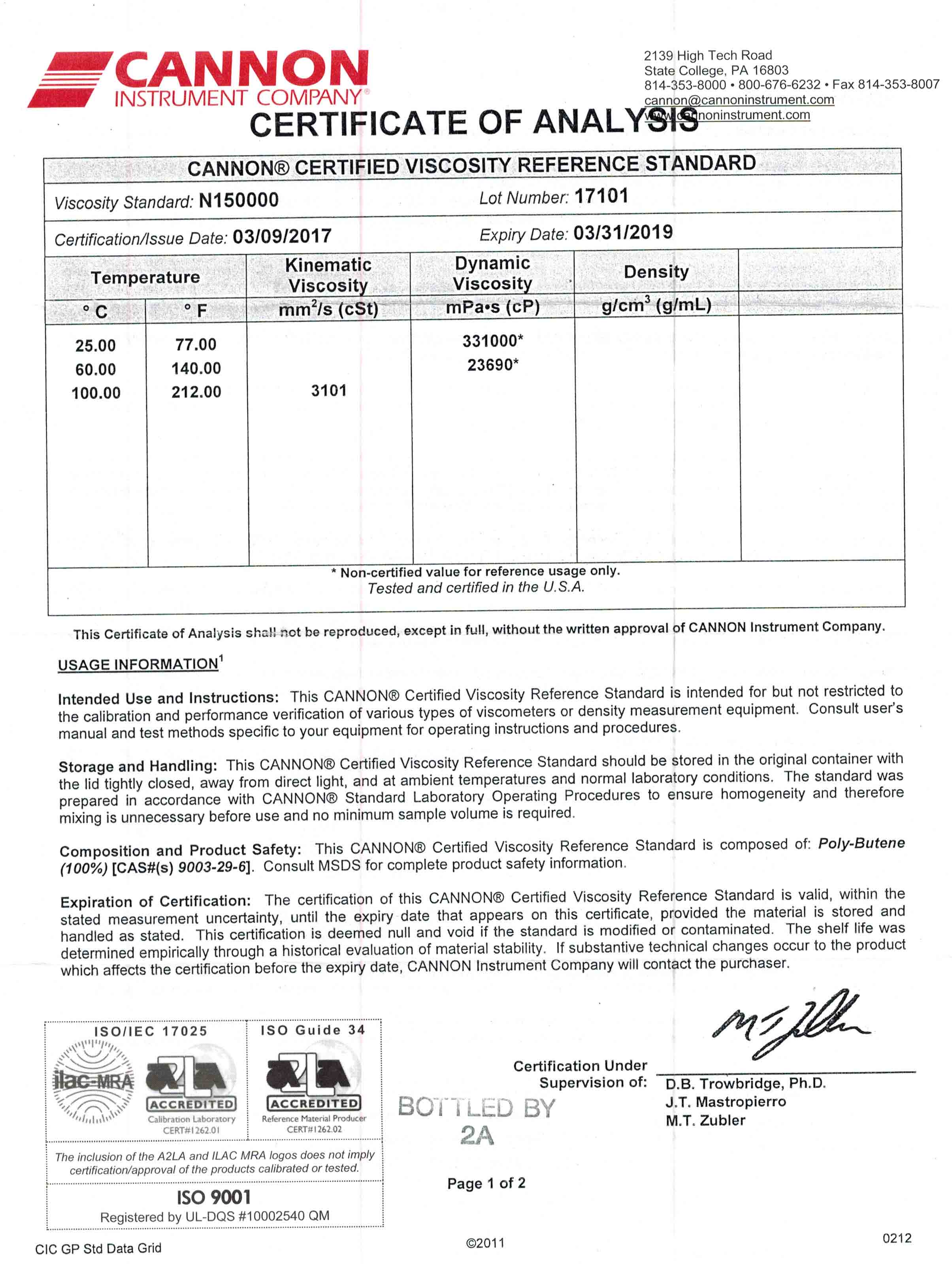 Table 3 High-Viscosity Standards Catalog Viscosity Approximate Viscosity in mPa.s(cP) Kinematic Number Standard Viscosity 20°C 25°C 40°C 60°C 135°C 60°C 100°C 68°F 77°F 104°F 140°F 275°F 140°F 212°F 9727-E10 N600 — 1100 — 160 17 200 — 9727-C52 N1000 2900 2000 800 280 — 350 80 9727-E15 N2000 — 4900 — 380 21 440 — 9727-C57 N4000 17000 11000 2900 730 — 850 120 9727-E20 N8000 — 20000 — 1400 — 1600 — 9727-C62 N15000 68000 41000 11000 2600 — 3000 360 9727-E25 N30000 130000 80000 — 4700 — 5400 — 9727-E27 N62000 — 200000 — 13000 — — 1600 9727-E29 N150000 — 420000 — 24000 — — 3000 9727-E30 N190000 900000 520000 140000 33000 — — 4000 9727-E35 N450000 — 1600000 — 100000 2350 — — 9727-E40 N2700000 — 5300000 — 340000 — — — 9727-E42 N2700000SP Dynamic Shear Rheometer (DSR) standard at 52,58,64,70,&76°C
